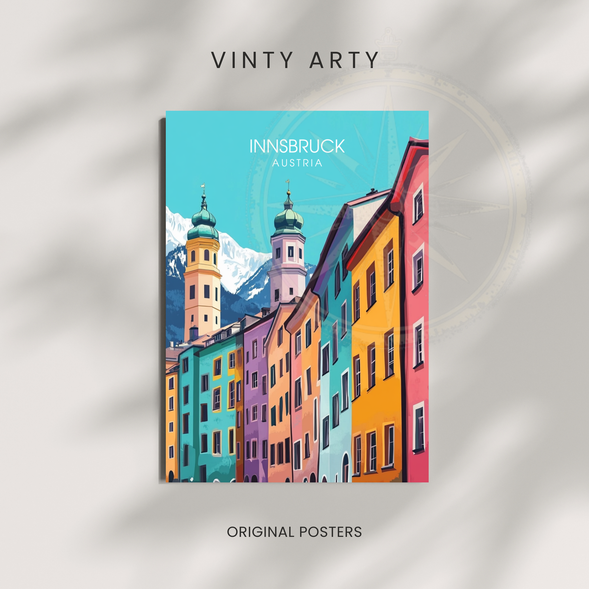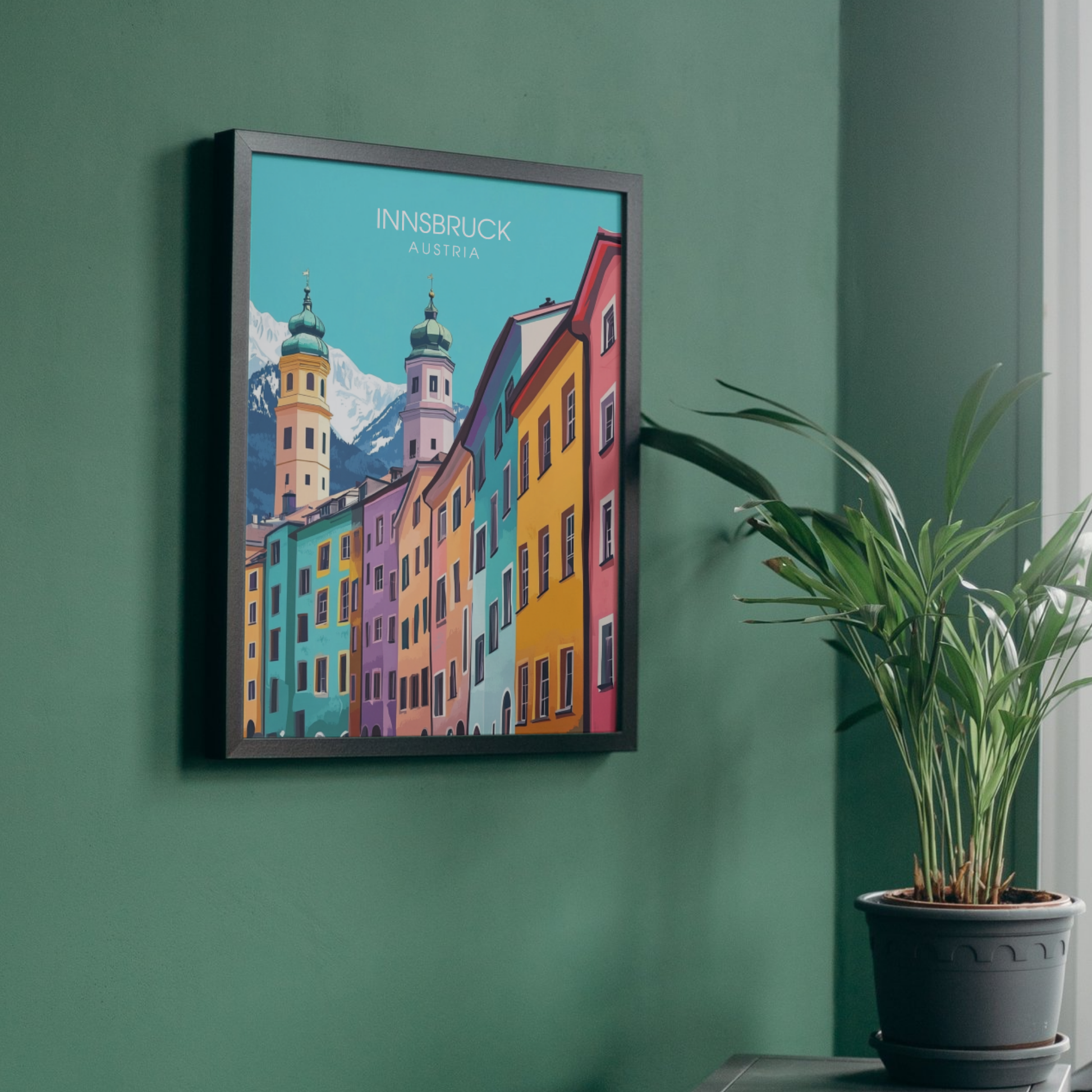Cette affiche illustrée Innsbruck Autriche est un véritable hommage graphique à cette ville emblématique des Alpes. Elle évoque à la fois les berges de l’Inn, les maisons pastel du centre historique et les sommets majestueux qui entourent la ville. Son style épuré lui permet de trouver sa place aussi bien dans un salon que dans un bureau ou une chambre.